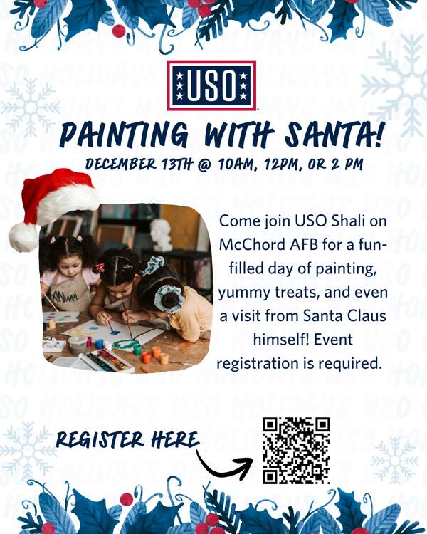 Join USO Shali as we host a special Paint with Santa Holiday event! All ages are welcome to come and show your creative side on canvas, and have a meet and greet with Santa as well. Supplies, lunch, pictures with Santa & and a gift are all included! Registration is required for this event. Please choose a specific time (10 AM, 12PM, or 2 PM) and only register for one time slot.